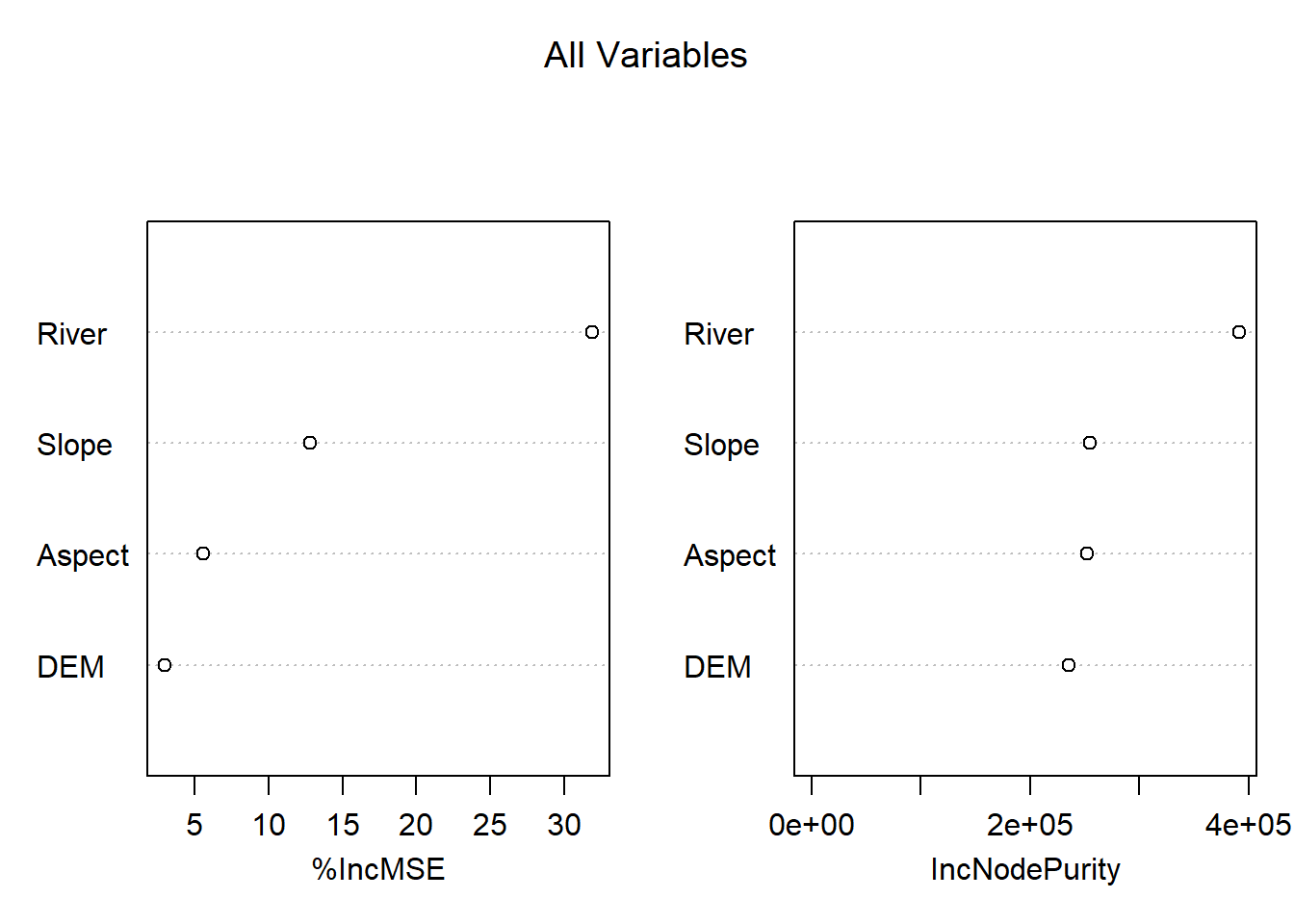 varImpPlot(MeuseRF, main="All Variables")