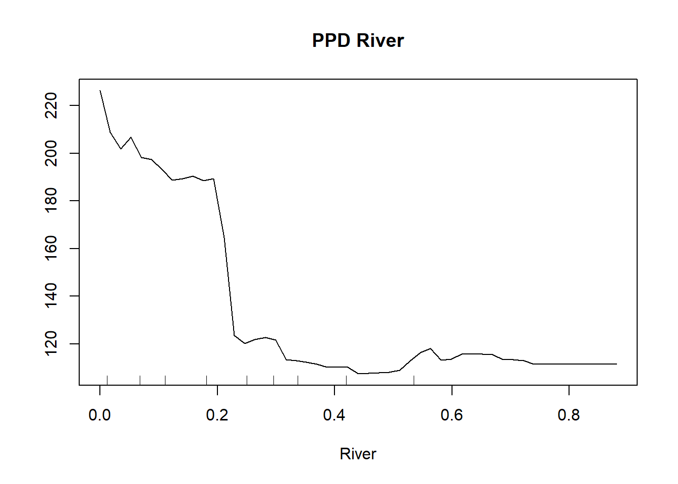 partialPlot(MeuseRF, Training.DF, River, , main = "PPD River")