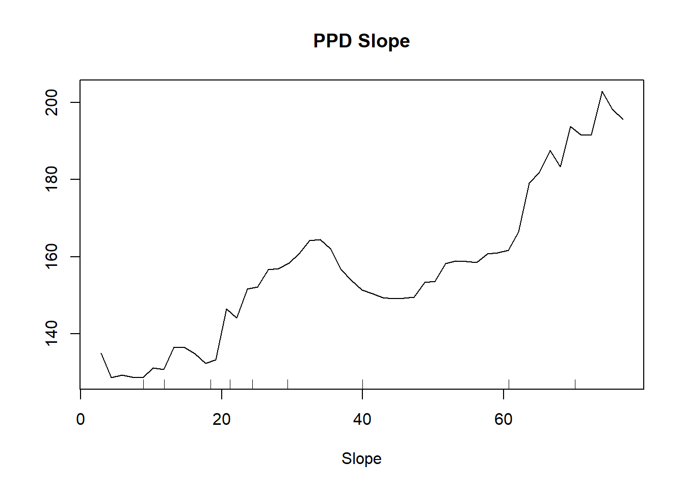 partialPlot(MeuseRF, Training.DF, Slope, , main = "PPD Slope")